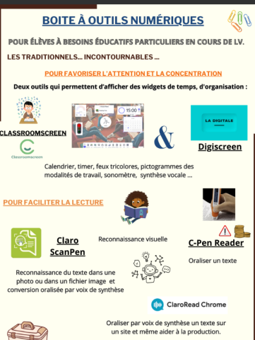 Quelques outils numériques pour travailler avec et faire travailler les élèves à besoins éducatifs particuliers : outils numériques traditionnels et avec I.A