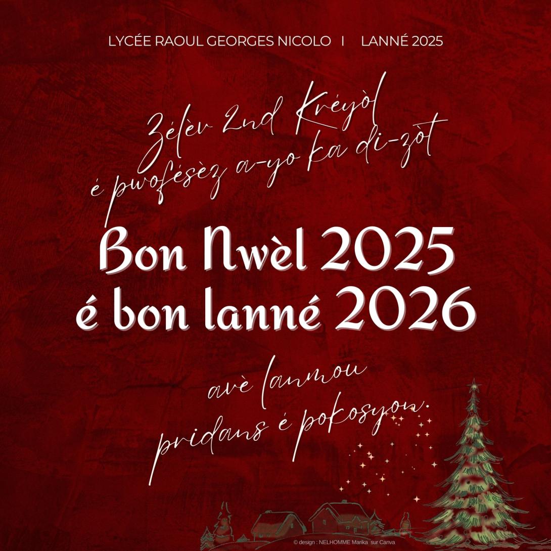 Dans le cadre d’un travail pédagogique mené en classe, avec leur professeure de créole certifiée, Marika Nelhomme, les élèves de créole du lycée Raoul Georges Nicolo vous adressent cette carte de voeux.