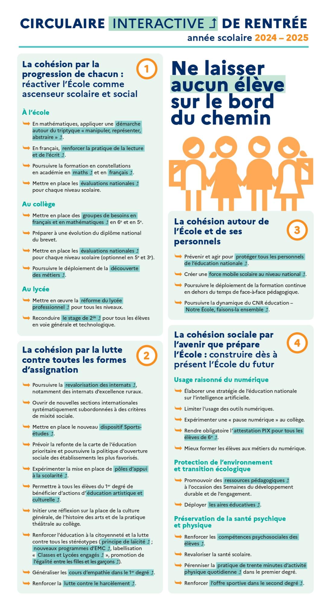 La circulaire de rentrée 2024 détaille les priorités de l'année scolaire 2024-2025 pour « ne laisser aucun élève au bord du chemin ». Elle est organisée autour de 4 axes. Le document proposé ci-dessous présente les grandes entrées de la circulaire. Cette version interactive permet d'accéder directement aux pages éduscol et education.gouv en cliquant sur les informations surlignées.