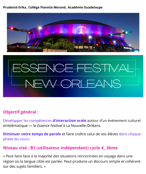 Une fiche d’ activités à l’attention d’élèves de niveau B1 pour développer les compétences d’interaction orale autour d’un événement culturel emblématique : le “Essence Festival” de La Nouvelle-Orléans.