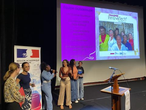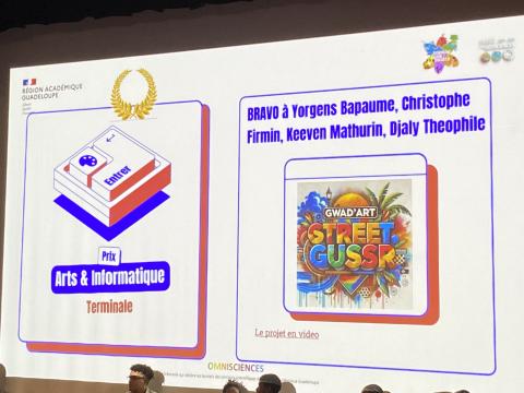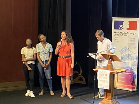 Remise du prix Challenge NSI par Mme TEILHAUD et M. SOMMERFELD aux élèves du Lycée Yves LEBORGNE de Ste Anne, pour leur travail sur les femmes et l'informatique.