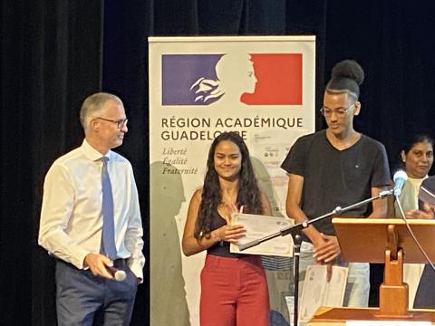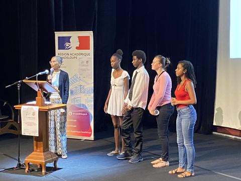 Remise des prix du concours "Même pas peur" par Mme CHOUVET aux élèves du collège Suze ANGELY de Vieux-Habitants et aux élèves du lycée Faustin FLERET de Morne-à-l'eau.