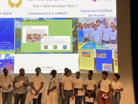 Les élèves du collège Appel du 18 juin du Lamentin et du lycée des Droits de l'Homme de Petit-Bourg reçoivent leur diplôme "d'Apprentis Chercheurs" des mains de Mme CELESTINE-MYRTIL-MARLIN de l'IRNAE, chargée de mission "sciences et société", sous l'œil de leurs professeures de SVT, Mme FRANCIUS et Mme TANNOUS.
