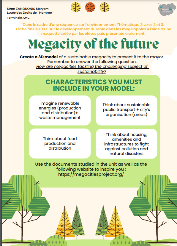 Dans le cadre d’une séquence sur l’environnement, Mme Maryem ZANDRONIS propose une tâche finale (E.O.C) sur le développement durable dans les mégalopoles à l’aide d’une maquette créée puis présentée par les élèves.