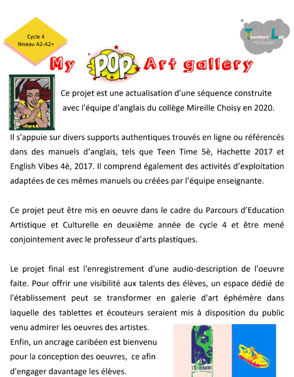 Une actualisation d'une séquence pédagogique de 2020 menée en collaboration entre enseignants d'anglais et d'arts plastiques. Le projet intègre le Pop Art et une approche culturelle caribéenne.