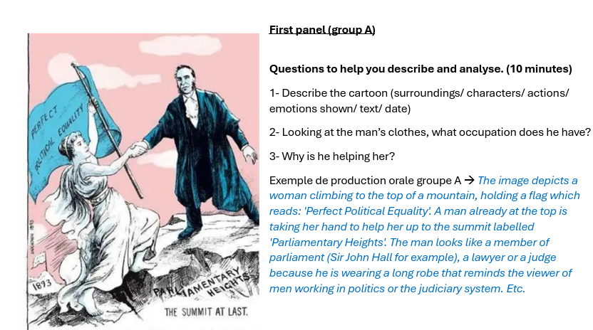 Une fiche d'activité pédagogique sur l'égalité des genres en Nouvelle-Zélande destinée à des élèves de Terminale, incluant des analyses de documents iconographiques et des discussions de groupes.