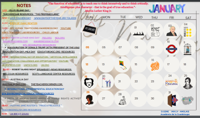 Retrouvez dans le calendrier du mois quelques événements associés à des liens menant à des informations officielles ou à des propositions de ressources à exploiter à votre guise.