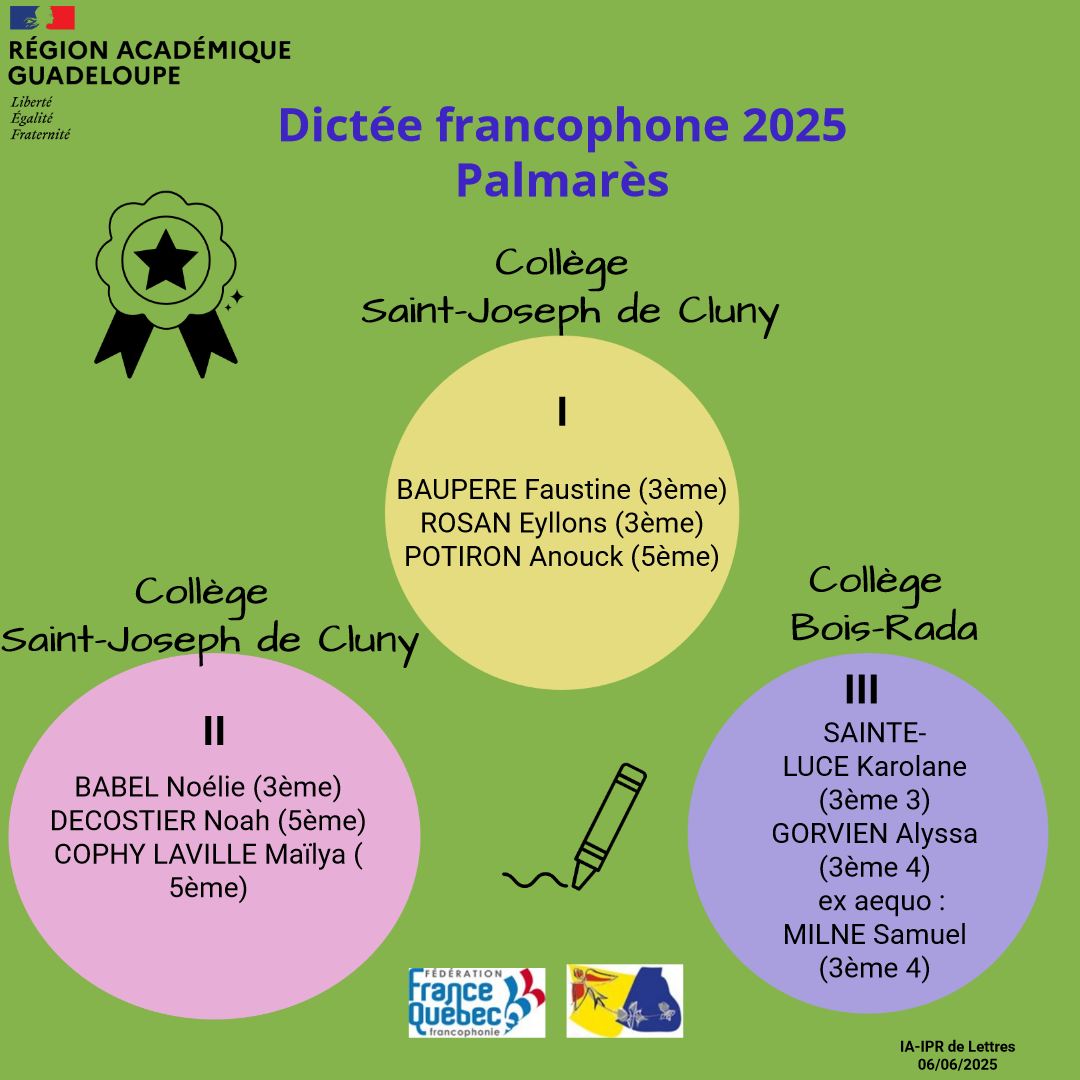 Dans le cadre de la Semaine Mondiale de la Francophonie, en mars 2025, trois établissements de l'académie se sont livrés au jeu de la "dictée francophone" : le collège Bois-Rada, le collège de Grand-Bourg et le collège Saint-Joseph de Cluny.