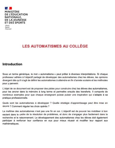 Il propose une méthodologie de construction d’une progression des automatismes sur un niveau donné et sur les quatre années du collège. La dernière partie du document présente des modalités pratiques visant à construire, développer et entretenir les automatismes.