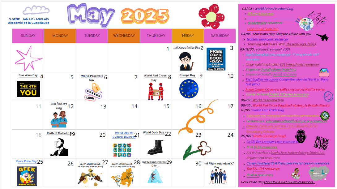 Ce mois-ci, nous vous proposons un petit focus sur les médias et le numérique avec quelques-uns des événements associés à des liens officiels ou à des propositions d’activités à exploiter à votre guise dans les thèmes suivants : World Press Freedom Day, Free Comic Book Day, Star Wars Day, Screen-Free Week, Netflix Series, Binge Watching, World Password Day, et Geek Pride Day entre autres.