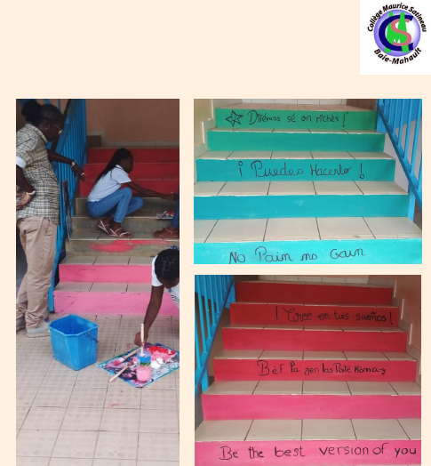 Parce que communiquer c'est le début du bonheur, lors de la semaine des langues, nous avons choisi au collège MAURICE SATINEAU de “bokanter” sur la communication interlangues comme vecteur de bonheur et de bien-être ! Entre Kahoot games, karaoké, réalisation de “marches du bonheur” et bien d’autres choses, les élèves ont pu s’épanouir pleinement tout en pratiquant les langues enseignées au collège!