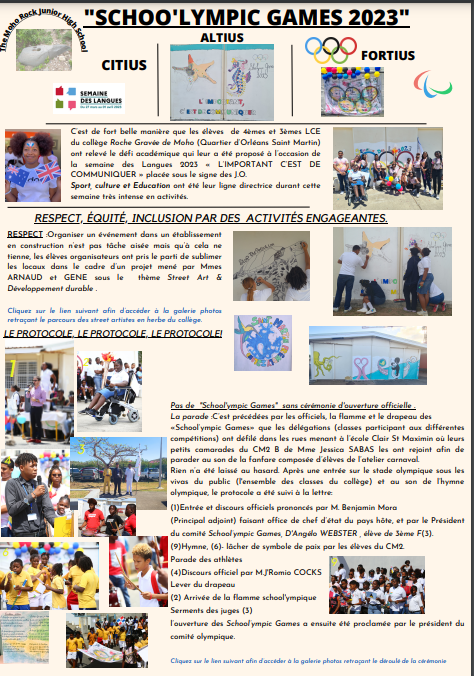 "Plus haut, Plus vite, Plus fort" : c’est le motto adopté par le collège La Roche Gravée de Moho (Quartier d’Orléans, Saint Martin) pour relever le défi académique proposé à l’occasion de la semaine des Langues 2023. Une semaine très intense, chargée en activités durant laquelle Sport, Culture et Éducation ont été la ligne directrice.