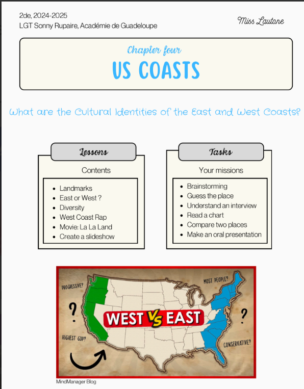 D’une côte à l’autre, l’Amérique en miroir : sons, cultures et identités. La séquence aborde les identités culturelles des côtes Est et Ouest des États-Unis. L'accent est mis sur le multiculturalisme en Californie et à New York. Les élèves apprendront en outre à identifier des états américains et des monuments célèbres.